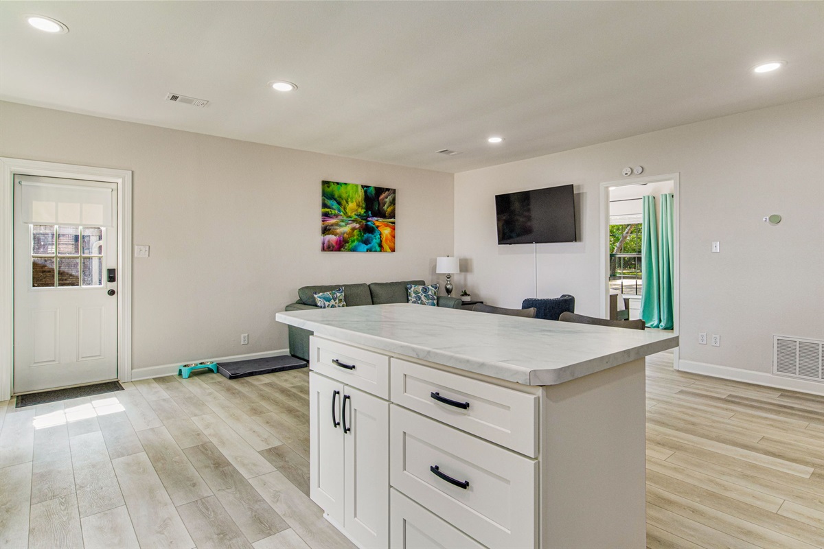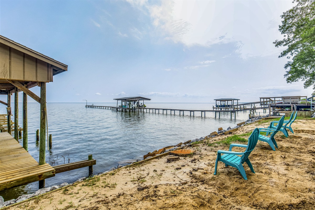 Your bayfront escape includes everything you need for a memorable vacation: fully equipped kitchen with breakfast bar, bright open living space with bay views, and modern conveniences throughout. Step outside to your private covered boat dock with cleats, expansive lawn with mature shade trees, and brick paver patio with turquoise Adirondack chairs overlooking the water. Pet-friendly with complimentary dog amenities, this bungalow welcomes your furry family members.