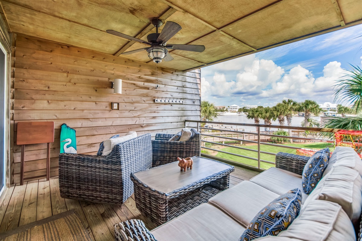 Your private covered balcony becomes the centerpiece of your Perdido Key experience. Featuring comfortable wicker furniture including loveseat, chairs, and coffee table, this riverside-view retreat offers front-row seats to palm trees swaying in Gulf breezes, boats gliding along the Intracoastal Waterway, and the kind of Florida sunsets that become vacation memories. The wood-planked ceiling and ceiling fan create that classic Florida porch atmosphere. Morning coffee here becomes ritual. Sunset cocktails provide the perfect end to beach-filled days. Watch waterfront activity unfold while reading, chatting, or simply soaking in the coastal lifestyle.
