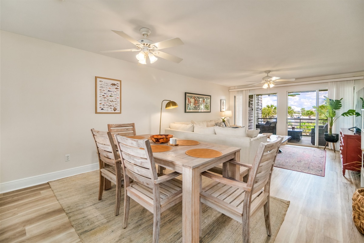 The spacious dining area features a beautiful wood table with bench seating and chairs, comfortably accommodating 6-8 guests. Whether you're serving fresh Gulf seafood from local markets, hosting game nights, or planning tomorrow's activities, this welcoming space becomes the heart of your Perdido Key vacation.