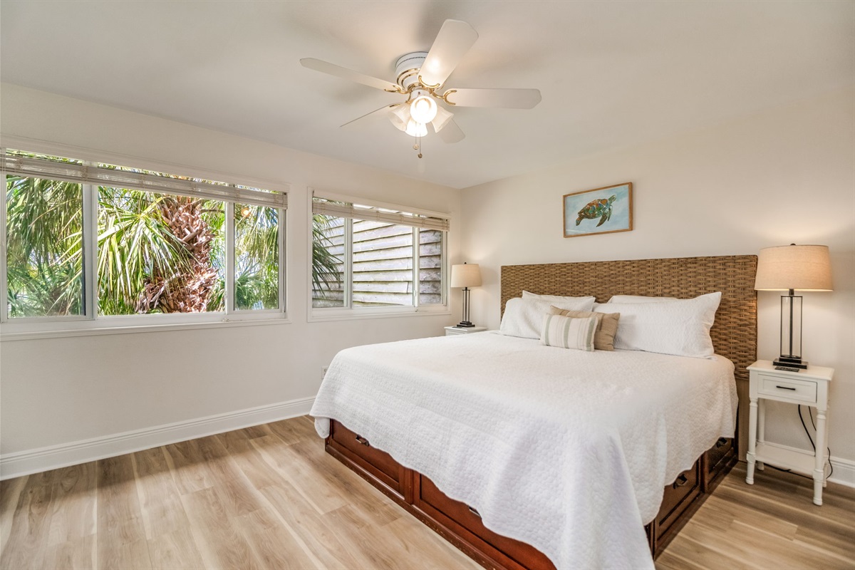 Primary Bedroom: Queen bed with coastal wicker headboard, bedside tables with lamps, ceiling fan, and windows providing natural light and cross-ventilation. Clean white linens and coastal-inspired décor create a peaceful retreat after sun-filled beach days. Access to beautifully renovated ensuite bathroom.