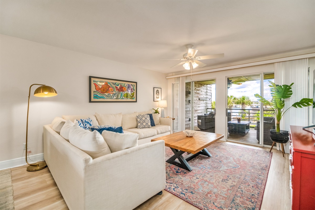 The bright open living area showcases wood-look flooring, comfortable seating with plush L-shaped sectional sofa, and coastal décor that feels both stylish and relaxed. Large sliding glass doors open to your private covered balcony, flooding the interior with Florida sunlight while framing river views and swaying palms. Flat-screen TV provides entertainment for movie nights or catching the game. Ceiling fans keep air moving. The open-concept layout connects living room, dining area, and kitchen, creating an inviting environment perfect for gathering after beach adventures, preparing family meals, or simply enjoying each other's company.