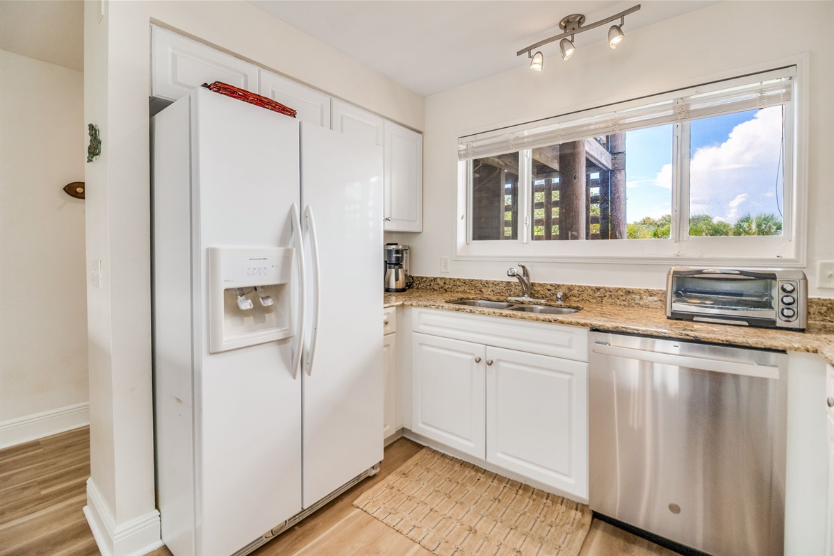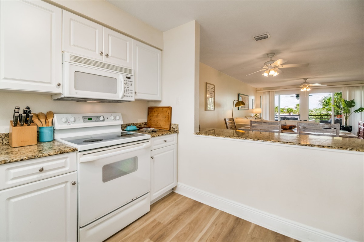 The fully equipped kitchen features white cabinetry, granite countertops, and a complete appliance package including electric range and oven, full-size refrigerator with ice maker and freezer, microwave, dishwasher, and breakfast bar seating. Complete cookware, pots, pans, dishes, utensils, wine glasses, and bakeware mean you're ready to prepare everything from quick breakfasts to full family dinners. Traditional coffee maker plus Keurig accommodate everyone's morning preferences. Blender for frozen drinks. All the kitchen essentials you'd expect in your own home.