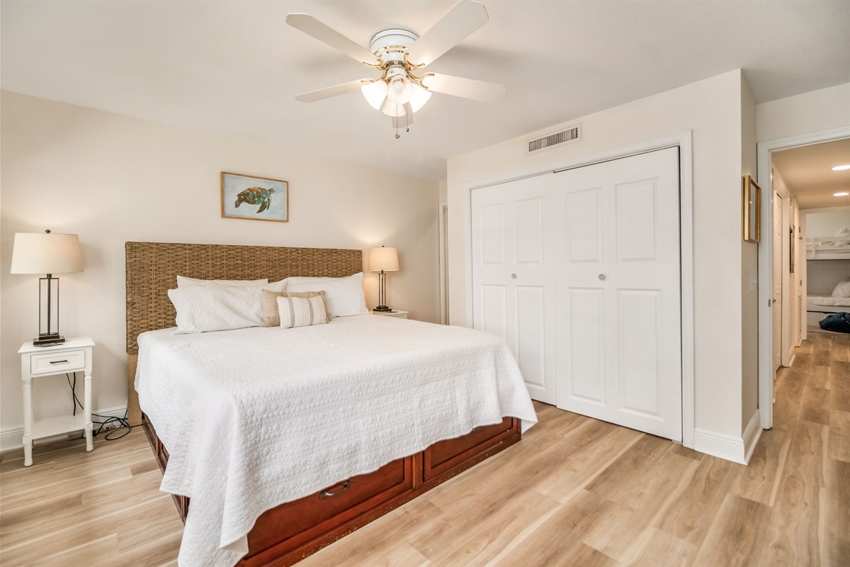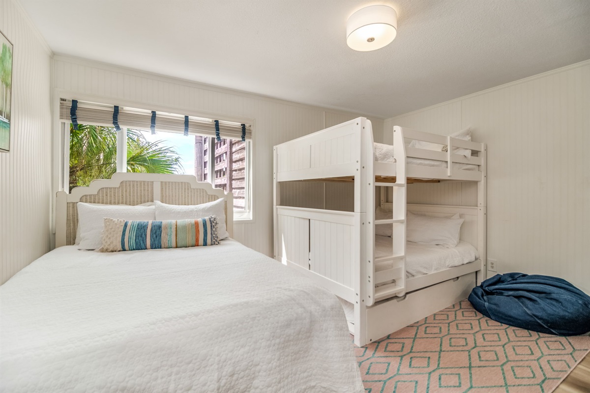 Guest Bedroom: Queen bed plus full-over-full bunk beds, sleeping 4 guests total in this versatile room. Perfect for families with children or groups traveling together. Ceiling fan, ample natural light, and coastal-themed décor throughout. The bunk configuration provides true sleeping space—not converted sofas or makeshift arrangements—making this ideal for kids or adults who want their own beds.