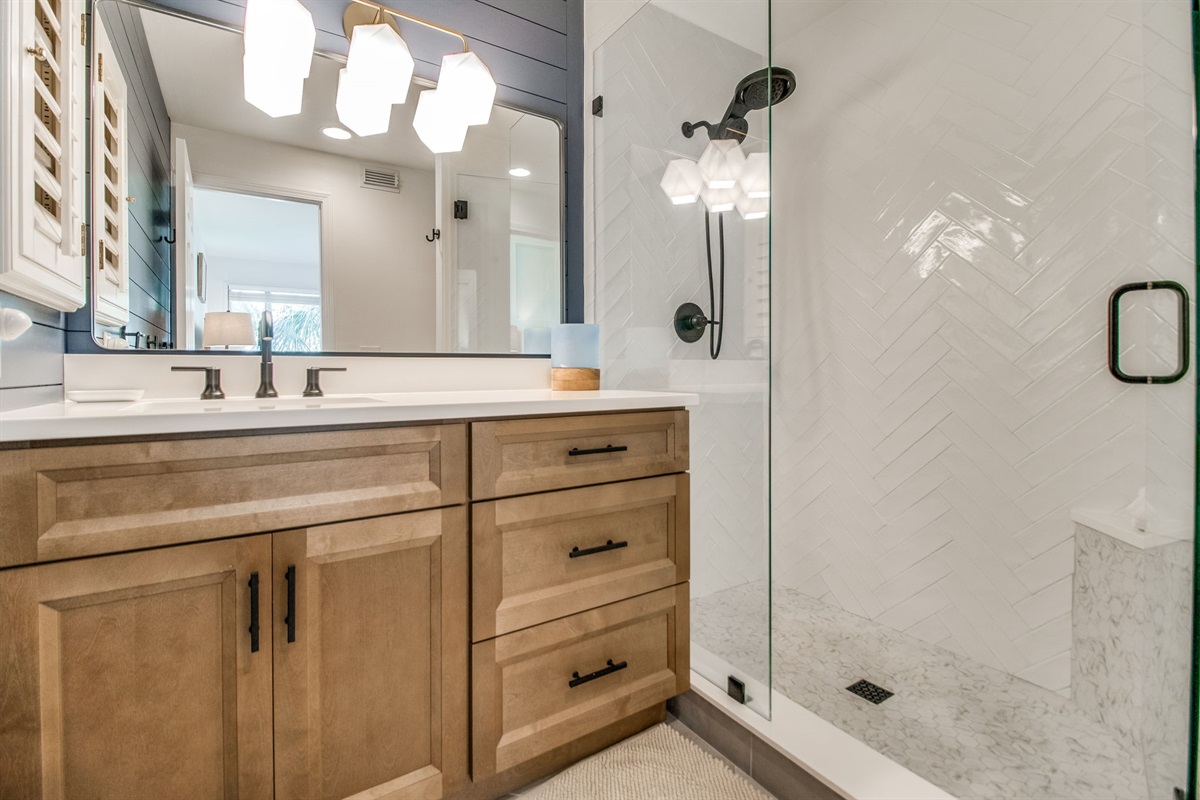 Primary Bathroom: Walk-in glass shower with white subway tile in chevron pattern, dual-sink wood vanity with modern black fixtures, tile flooring, excellent lighting, and contemporary coastal style. Fresh towels and initial toiletries provided.