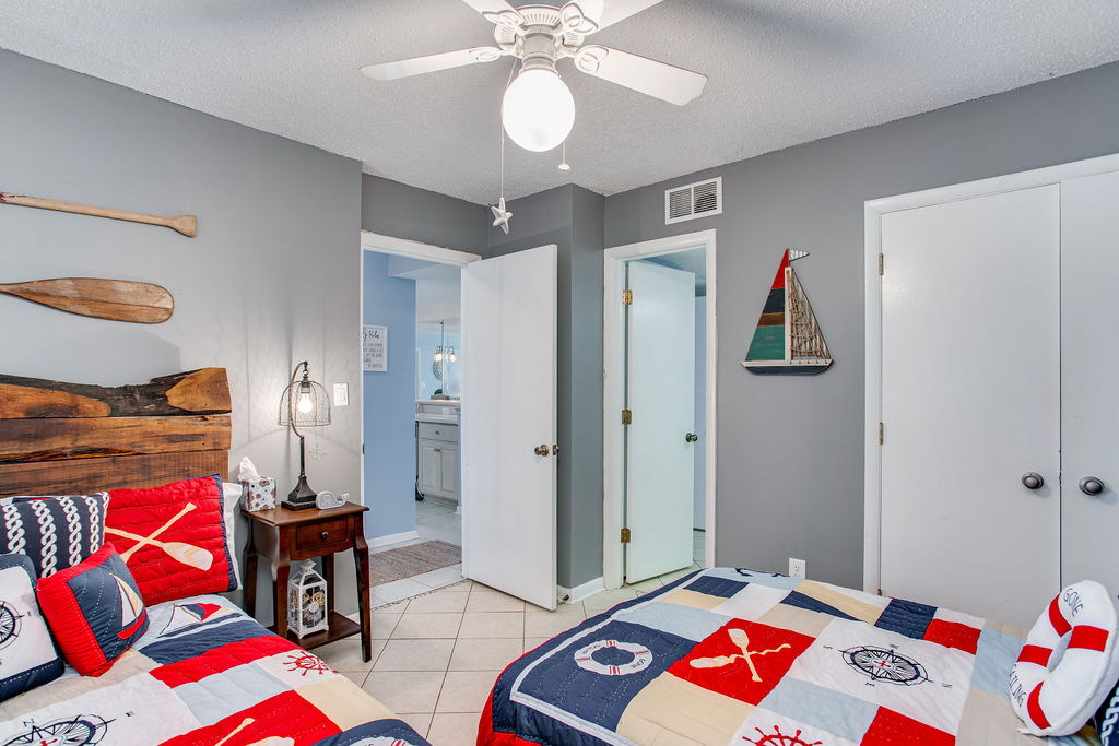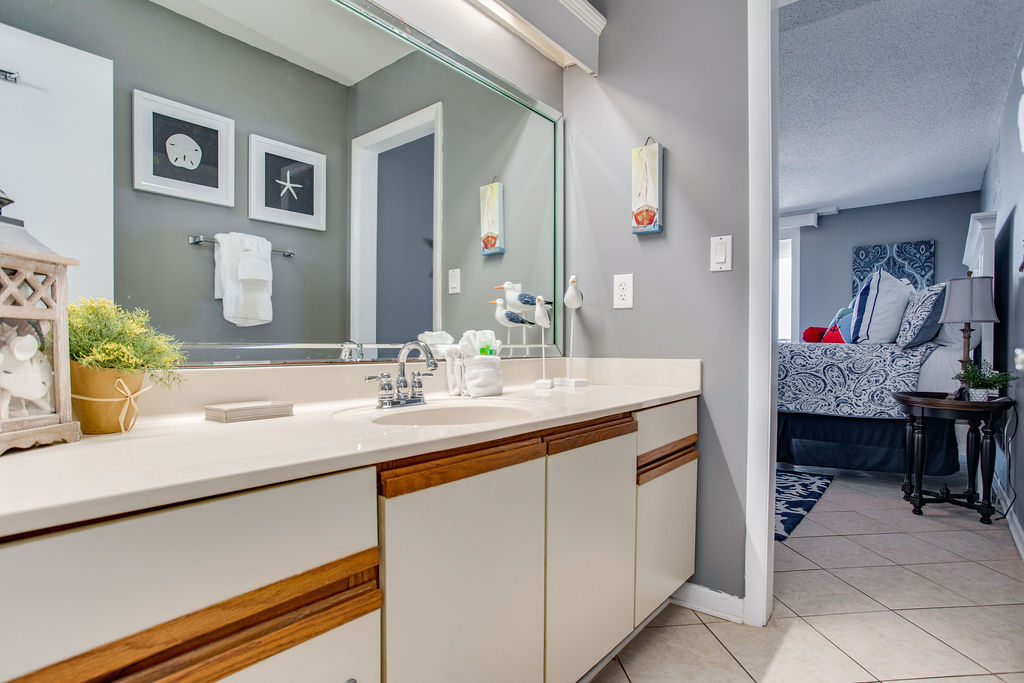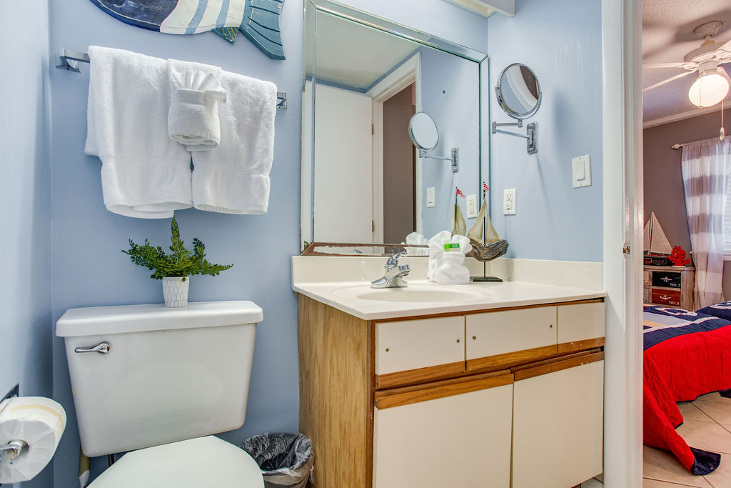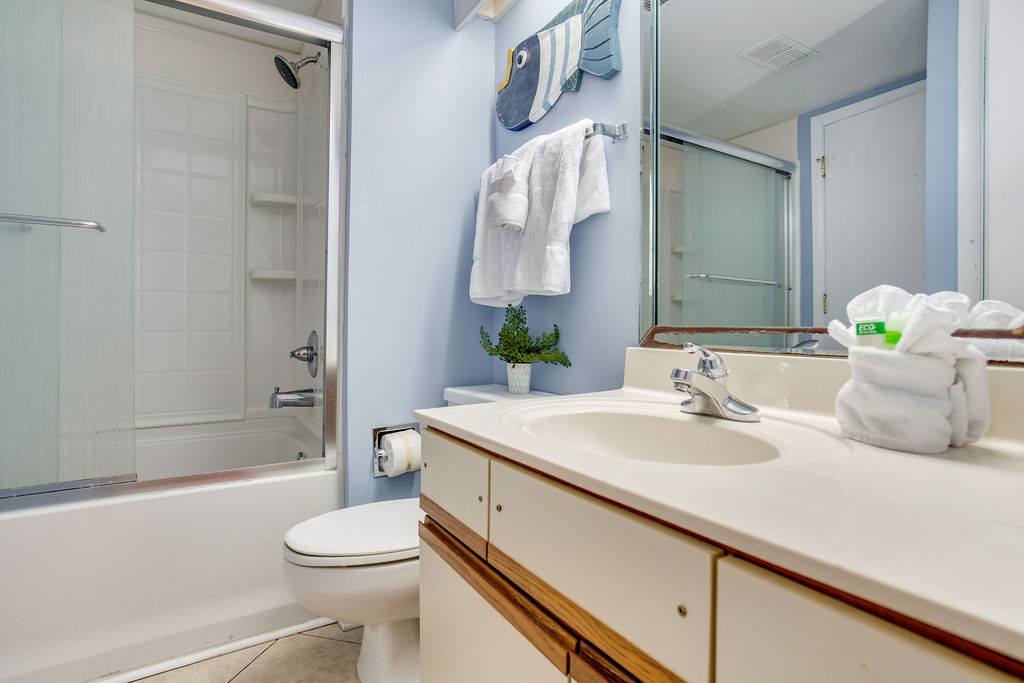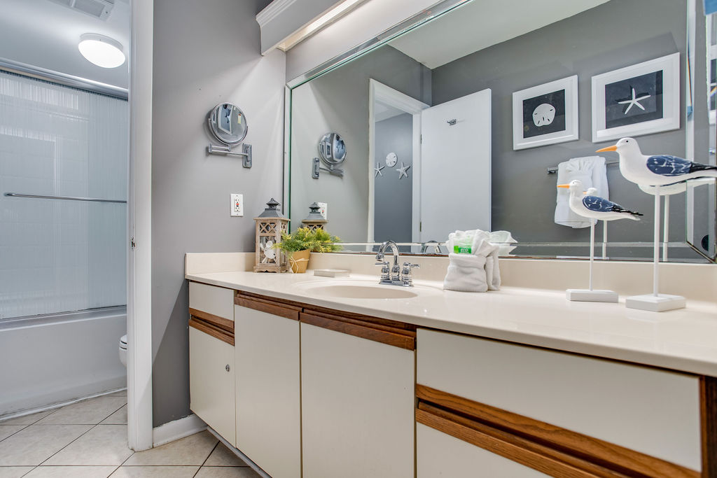 Guest Bathroom (Private): Single vanity, tub/shower combination, private access from guest bedroom with double beds