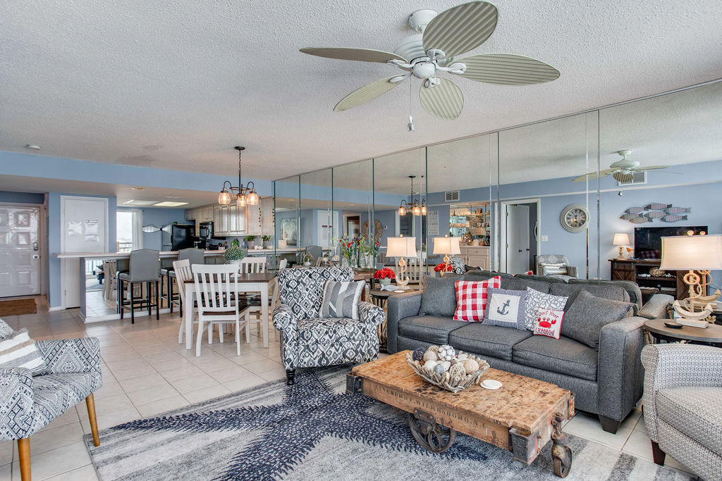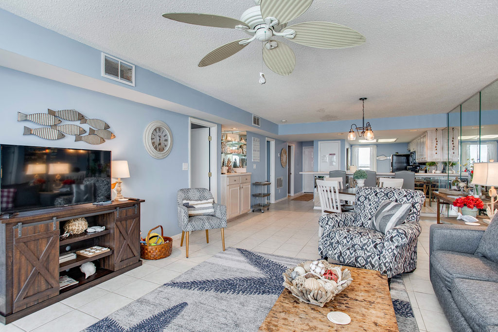 The open-concept living area features a large 50" TV and comfortable seating including a queen sofa sleeper and 2 queen chairs—plenty of room for everyone to gather. Floor-to-ceiling sliding glass doors frame Gulf views and provide access to the large ocean-view balcony. The wet bar with shiplap accent wall adds character and convenience for entertaining.