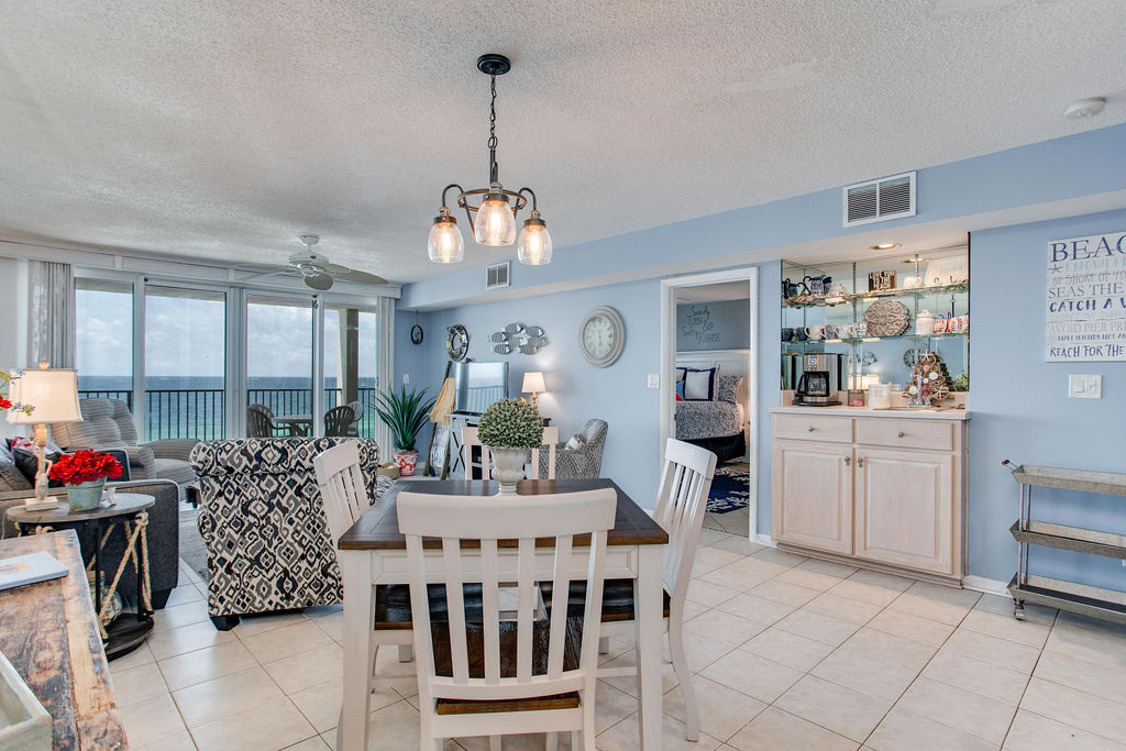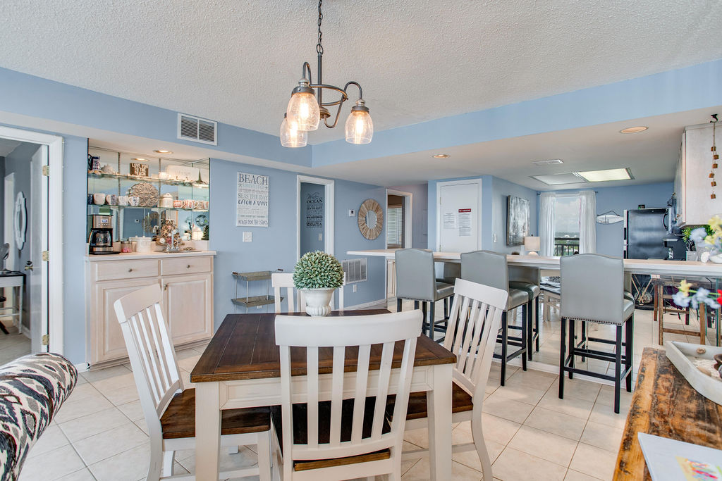 The small dining table seats 4 guests comfortably, with additional breakfast bar seating for 3 at the kitchen—total dining capacity for 7 inside. Whether you're gathering after a beach day or playing games, there's room for everyone inside—or move to the large balcony for outdoor dining with Gulf views.