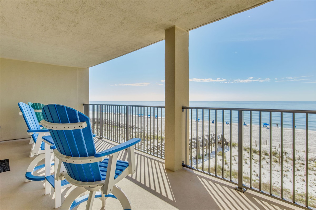 Your large covered balcony offers wonderful ocean views perfect for dolphin watching and enjoying the coastal breeze. Furnished with blue outdoor chairs and a dining table—ideal for al fresco meals, morning coffee, or evening cocktails while watching sunset over the Gulf. The sugar-white sand beach is just steps from your door.