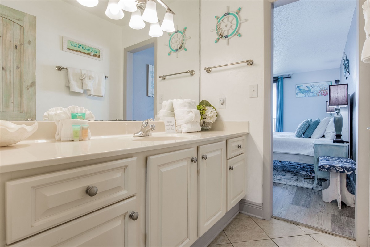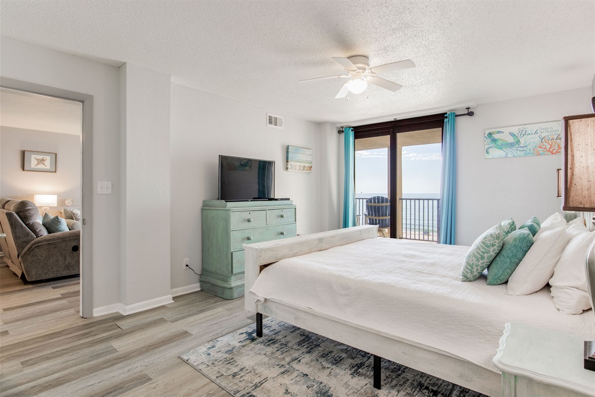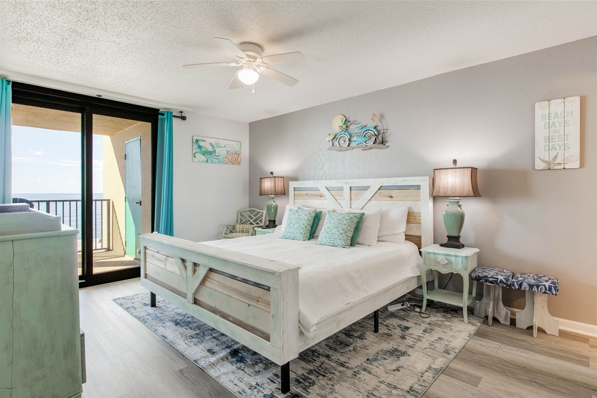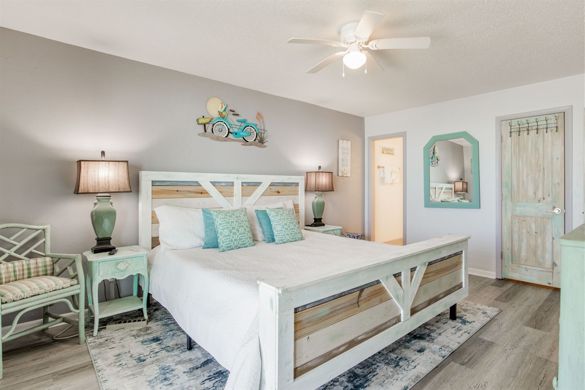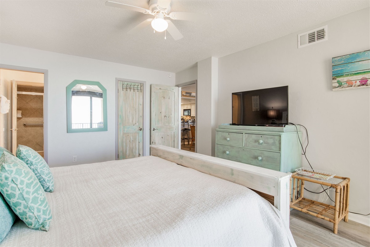 Primary Bedroom: King bed, large walk-in closet, ensuite bathroom with single vanity and spacious walk-in shower, Gulf views