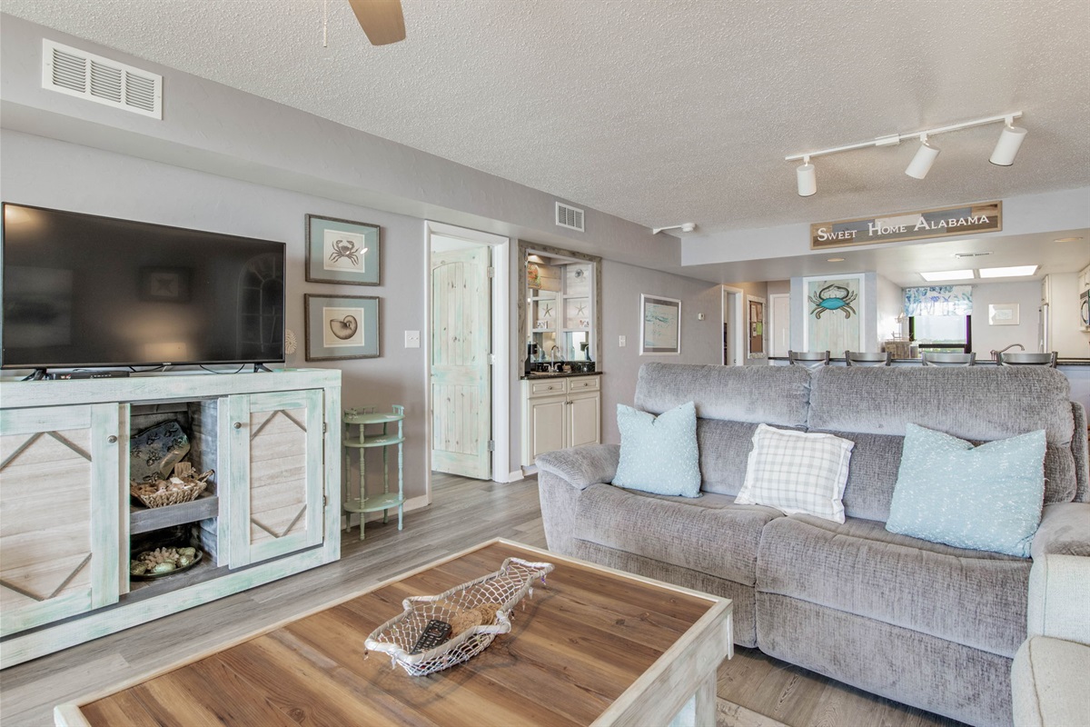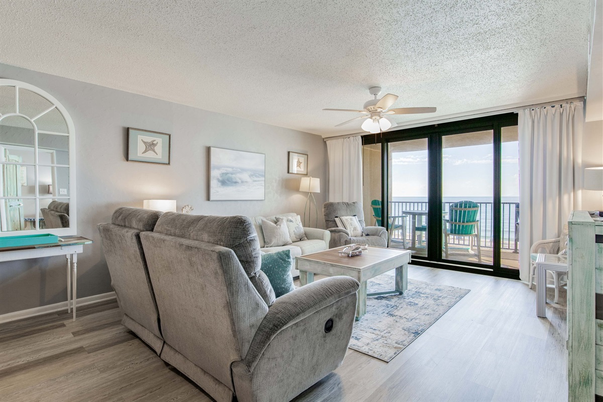 The open-concept living area features recently installed vinyl plank flooring throughout—durable, attractive, and easy for beach-sand cleanup. Floor-to-ceiling sliding glass doors frame Gulf views and provide access to the large covered balcony. The comfortable seating includes a sofa (converts to queen sleeper), loveseat, and additional seating arranged for TV viewing and conversation. Streaming-capable TV accommodates your own accounts.