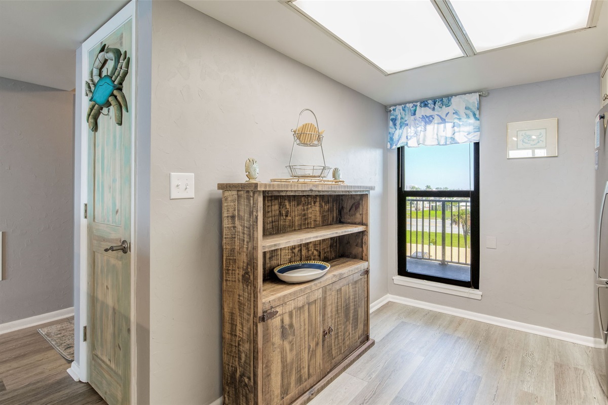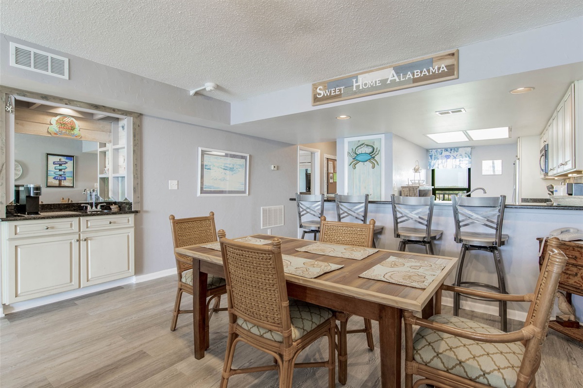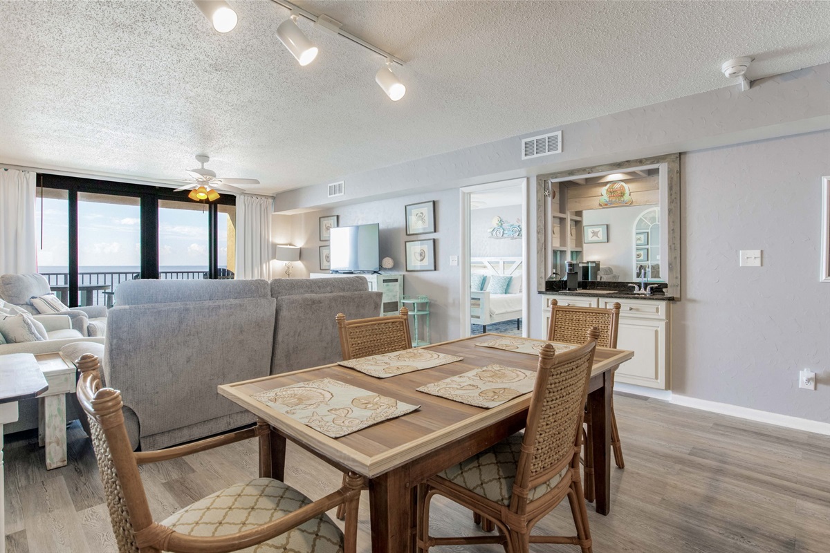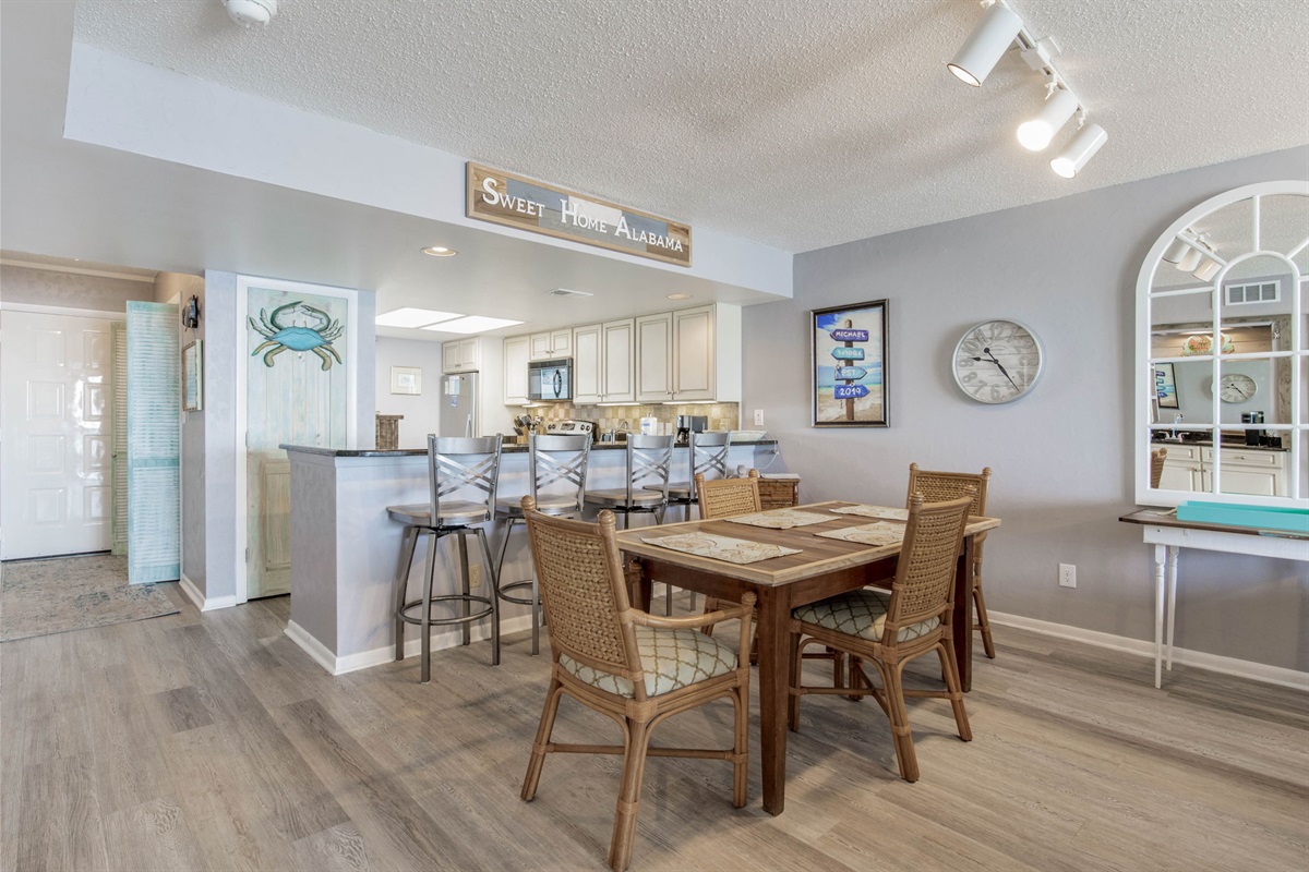 The dining table seats 6 guests comfortably, with additional breakfast bar seating at the kitchen. Whether you're gathering for meals, playing games, or enjoying morning coffee, there's room for everyone inside—or move to the large balcony for al fresco dining with Gulf views.