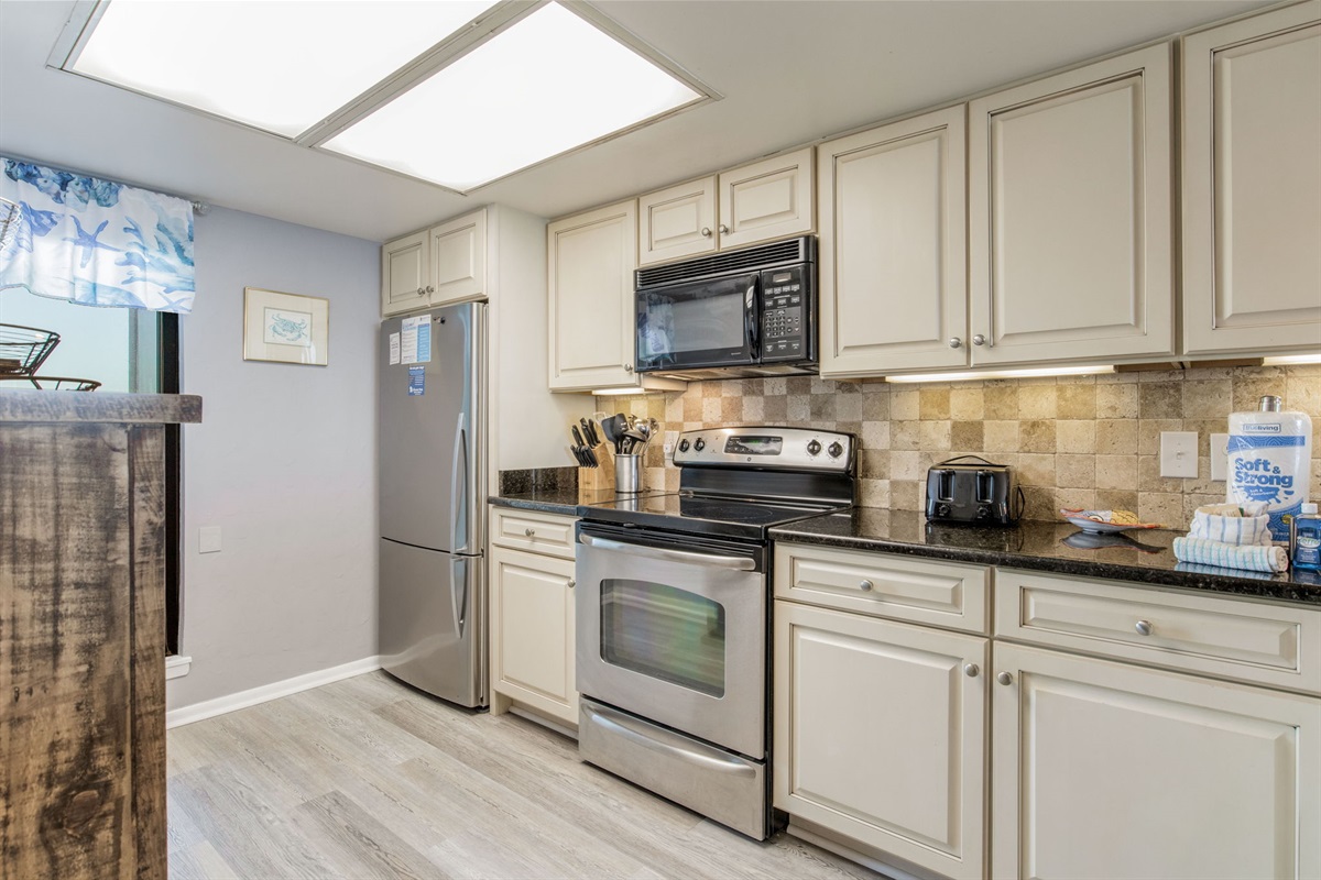 The fully equipped kitchen features white cabinetry, modern appliances, and complete cookware and dishes for 7+ guests. Traditional coffee maker included. Ample counter space and storage make meal preparation easy. The open kitchen design allows the cook to stay connected with guests in the living and dining areas.