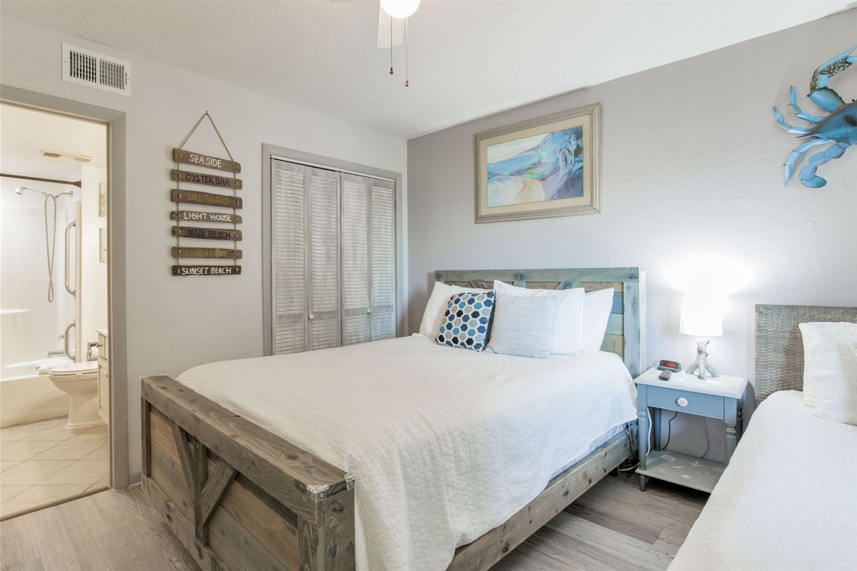 Guest Bedroom: Queen bed + Twin bed (sleeps 3), closet, attached bathroom with tub/shower combination