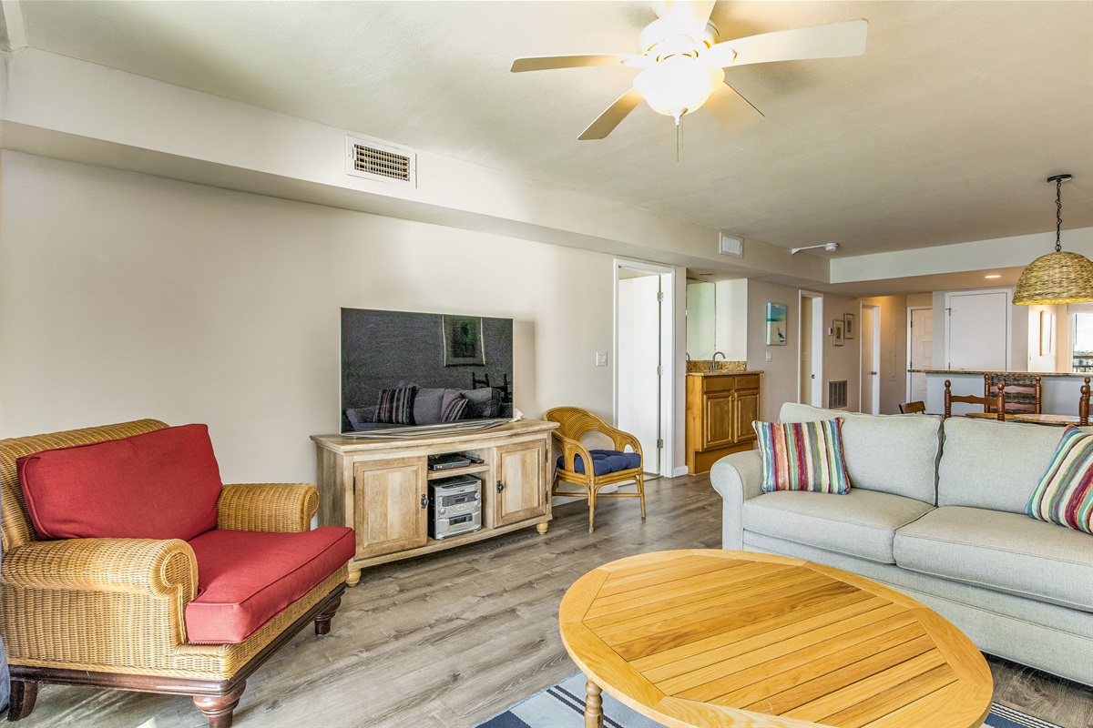 Experience Orange Beach at Wind Drift 505 SE, a 2-bedroom, 2-bathroom Gulf-front condo that sleeps 5 guests. This beachfront vacation rental features spectacular Gulf views visible from the moment you walk through the front door, open-concept living and dining spaces, granite countertops in kitchen and both bathrooms, high-top breakfast bar with seating, dining table seating 6, high-top 4-seater table on the balcony, large walk-in closet in primary bedroom with space for bulky luggage, oversized granite countertop in primary bathroom, guest bedroom with queen bed PLUS twin bed (sleeps 3), guest bathroom with dual access from bedroom and living area, and direct access to Wind Drift's exceptional dual-waterfront amenities.