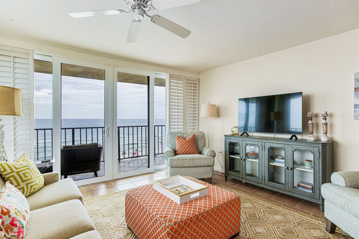 The open-concept living and dining area is bright and welcoming, with tile flooring throughout and large sliding glass doors that connect the interior to the wraparound balcony. The living room is furnished with a comfortable sofa, coastal-styled décor in warm coral and teal tones, and a ceiling fan overhead. A flat-screen TV on a media cabinet anchors the main living space, and natural light pours in from the Gulf-facing windows all day long. The dining area is positioned adjacent to the kitchen, keeping the whole group connected during meals.