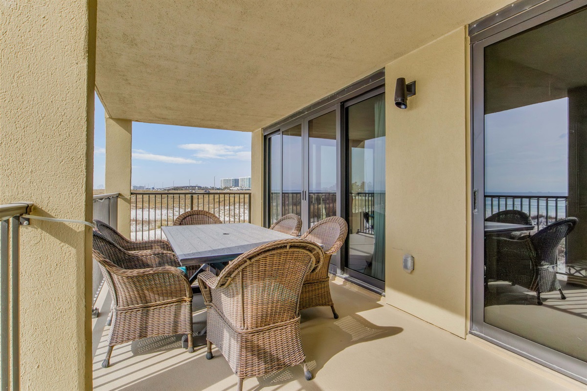 Floor-to-ceiling sliding glass doors opening to Gulf-view balcony