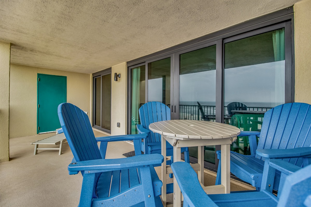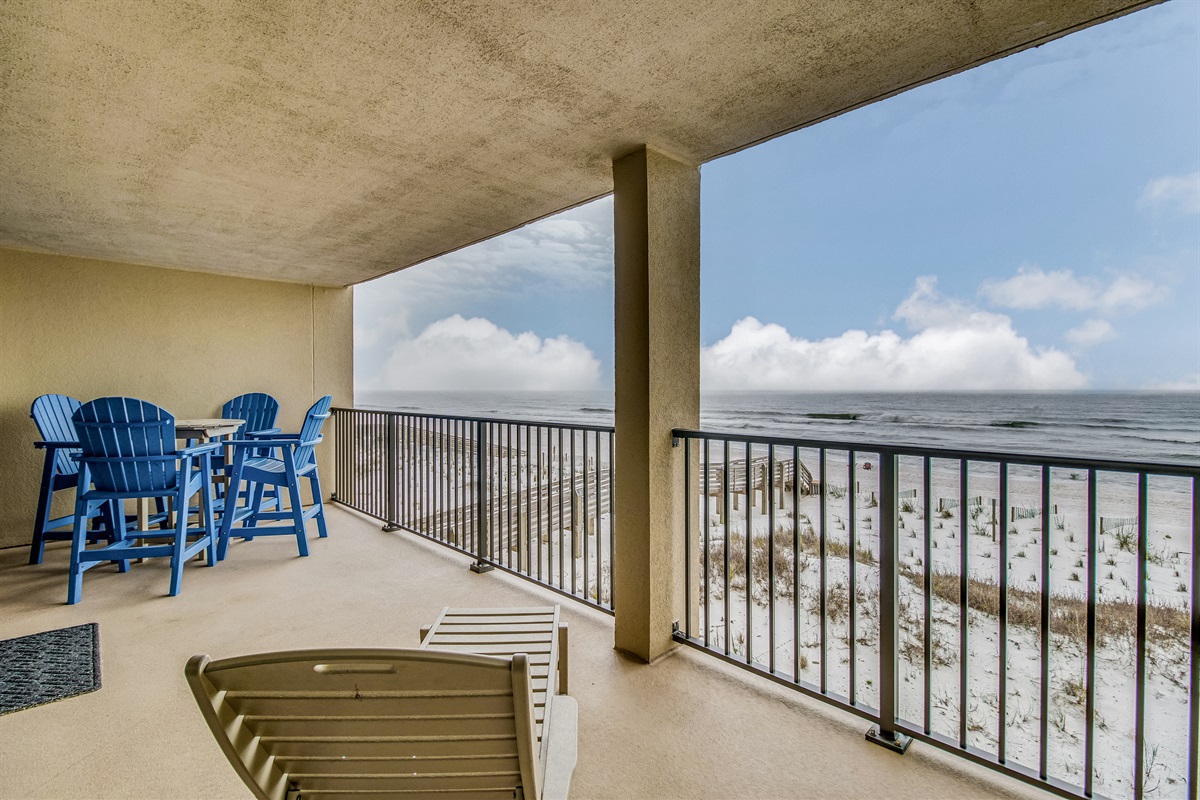 Your large covered balcony offers ocean views perfect for dolphin watching. Furnished with 4 high-top wooden chairs at a dining-height table and 2 lounge chairs—ideal for morning coffee, evening cocktails, and sunset viewing. The covered design provides shade during hot afternoons while maintaining the Gulf breeze.