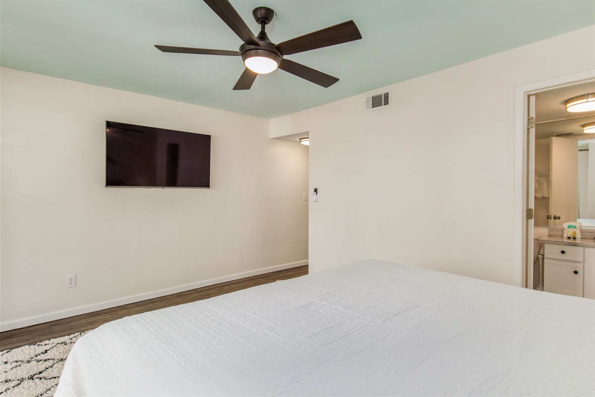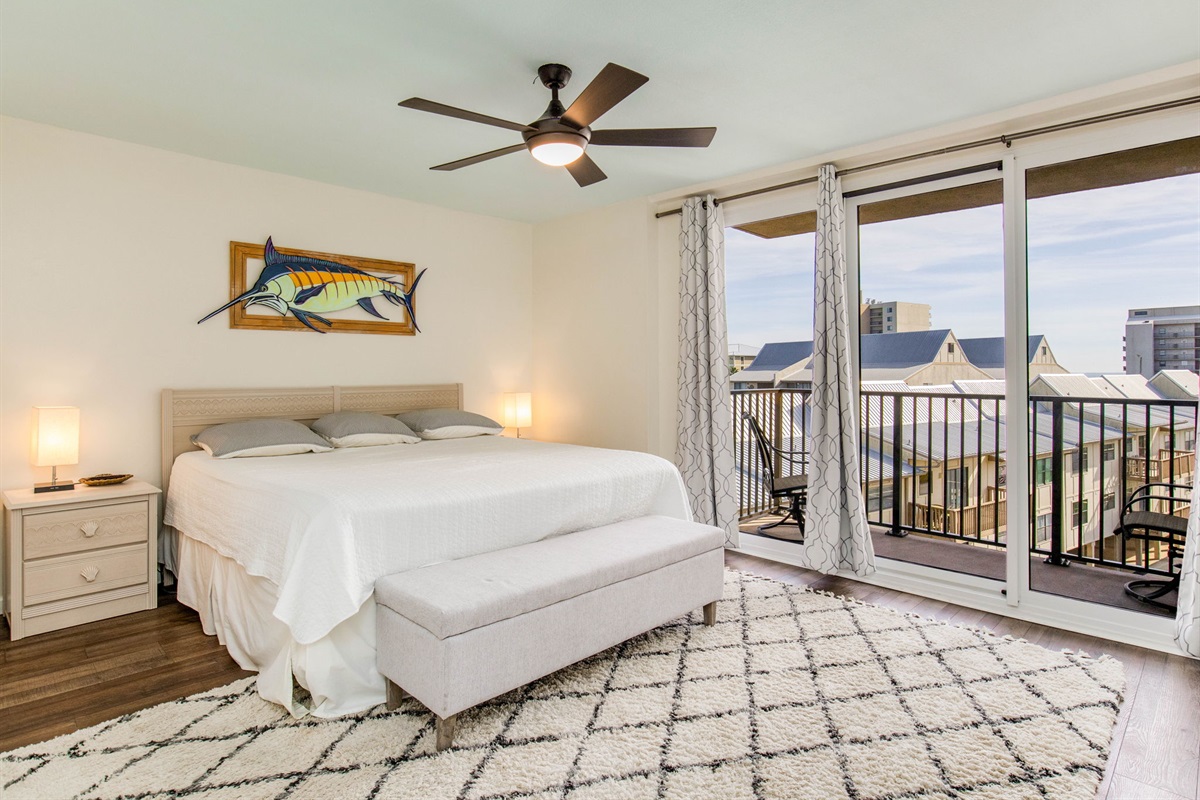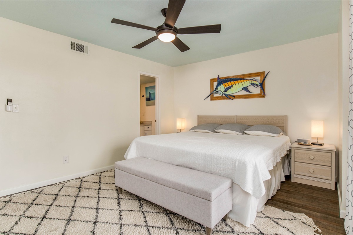 Primary Suite: King bed providing luxury sleeping for 2 guests, private ensuite bathroom with tub/shower combination, Old River views, ceiling fan, TV, quality linens, and direct balcony access where you can step outside to morning coffee with bay views. The primary suite gives parents or couples privacy with ensuite convenience and water views that make waking up special.