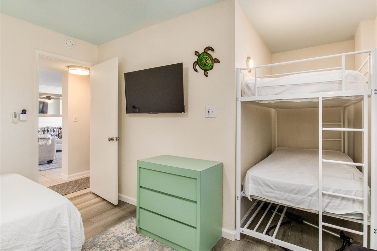 Guest Bedroom 2: Full bed sleeping 2 guests plus twin-over-twin bunk bed sleeping 2 additional guests for total capacity of 4 guests in this room. Ceiling fan, TV, quality linens, and shared bathroom access. This configuration is perfect for families with kids who want to share a room or multiple guests who don't mind bunking together. The full bed provides comfortable sleeping for adults or older kids, while the twin bunk gives younger children their own sleeping space.