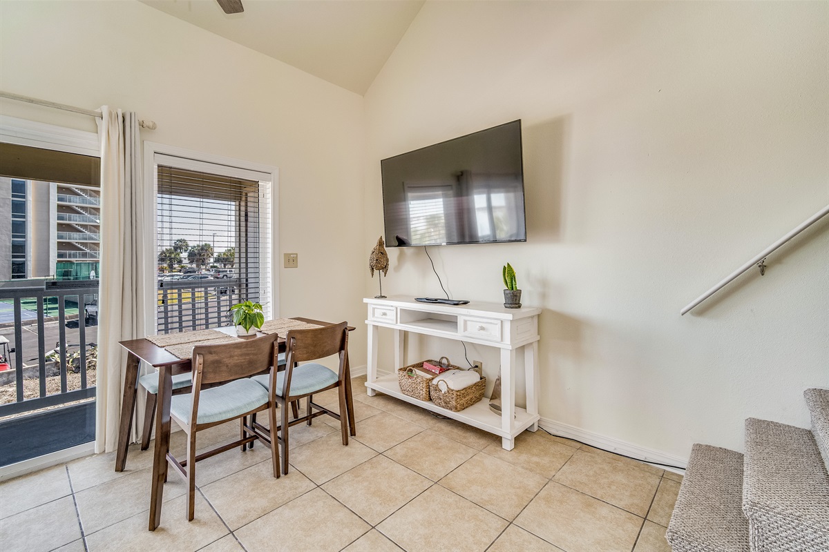 The main-level living room is bright and welcoming, anchored by a comfortable sofa, a wood-topped coffee table, and a 65" Smart TV with streaming capability. Large sliding glass doors connect the living area directly to the private balcony, keeping the sea breeze moving through the unit and making the indoor-outdoor flow feel completely natural.