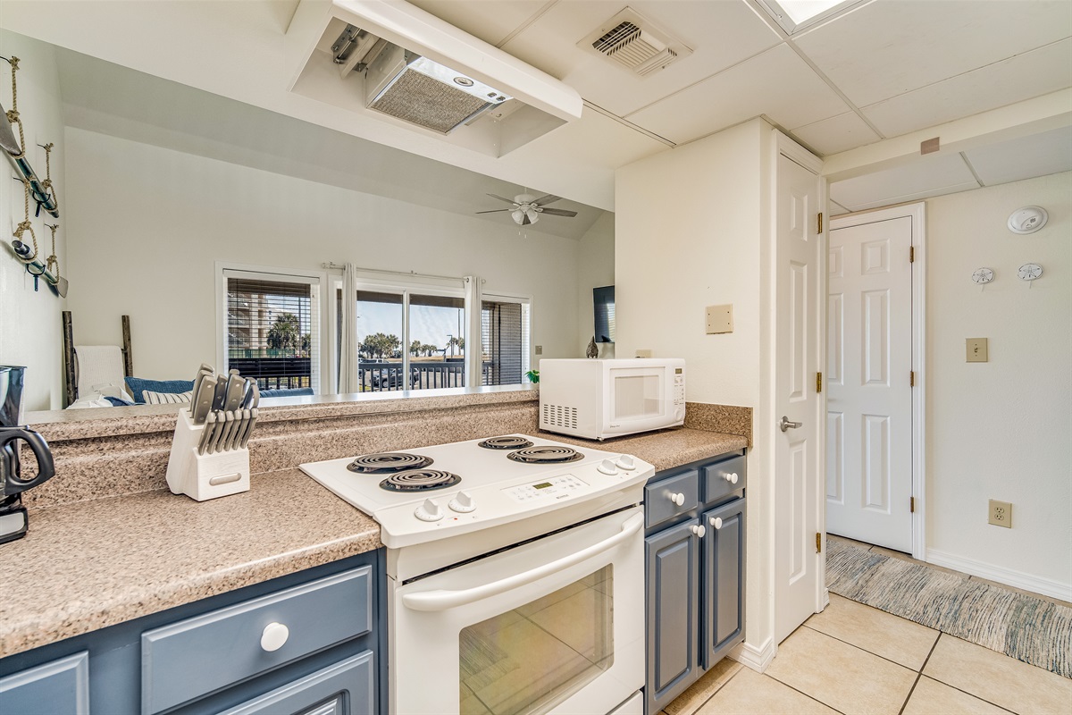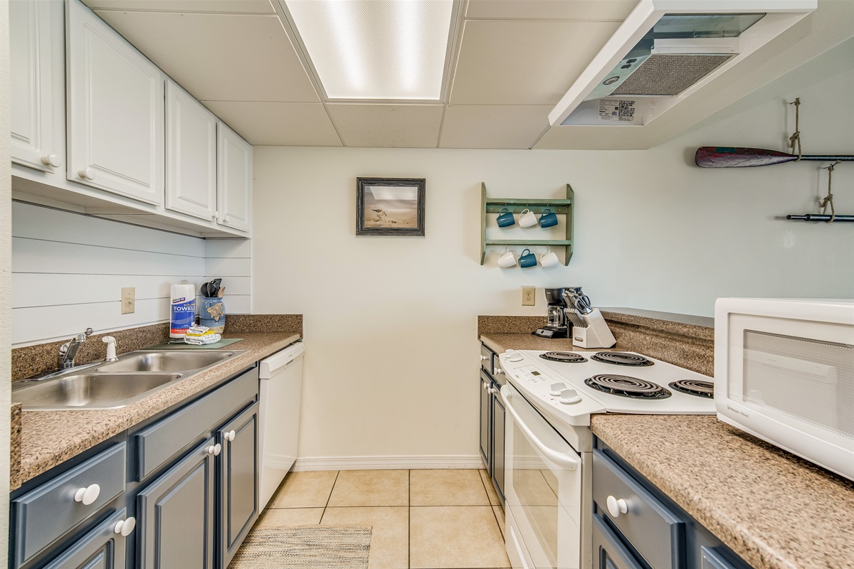 The recently renovated kitchen features bold navy lower cabinetry, updated countertops, and a full suite of appliances including a full-size refrigerator, electric stove and oven, and microwave. A traditional drip coffee maker, complete cookware, dishes, and utensils for six are provided. The breakfast bar bridges the kitchen and the living area, keeping the cook connected to the room — a layout that works especially well for busy family vacation mornings.