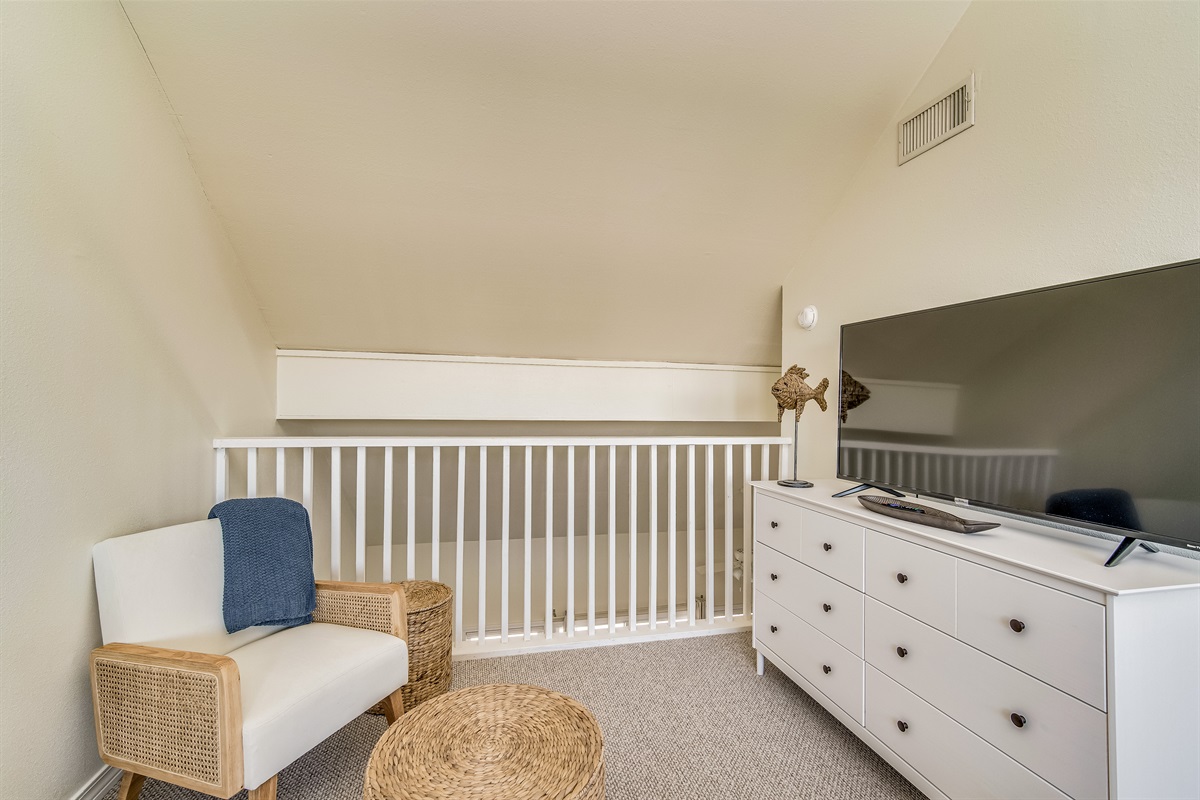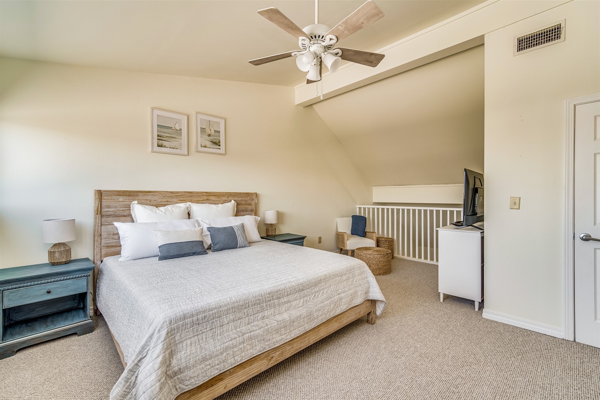 King Bed (Upstairs Loft): The primary sleeping area features a king bed dressed in fresh linens, a 55" Smart TV, and a ceiling fan beneath a soaring vaulted ceiling — the architectural highlight of this loft-style unit. The open, airy feel of the upstairs is genuinely unexpected for a one-bedroom floorplan and is one of the things guests consistently love about this unit.