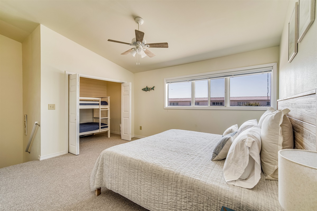 Total Sleeping Capacity: 6 guests — 1 king bed, 1 twin-over-twin bunk set, 1 queen sleeper sofa.
