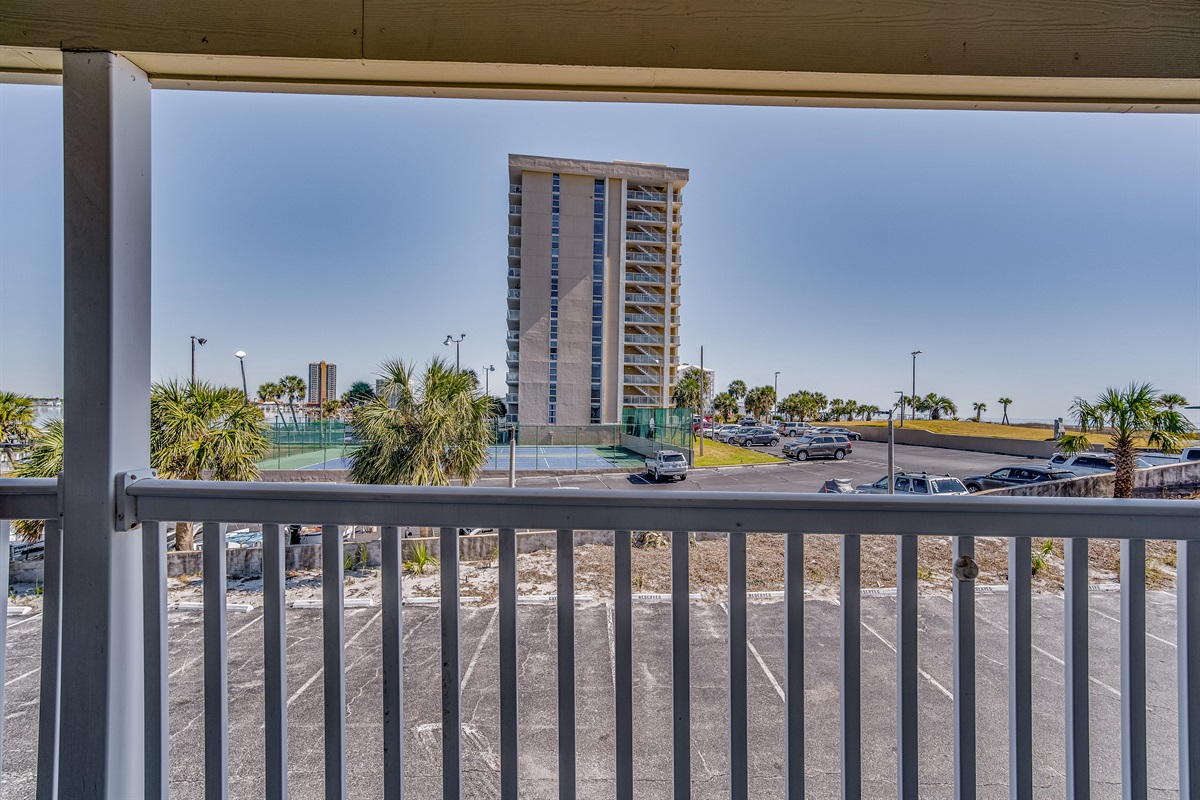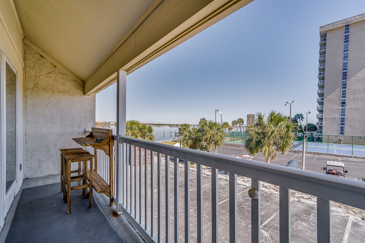 The private balcony extends off the main living area and overlooks Little Sabine Bay, framed by palm trees and the building's lush landscaping. It's a genuinely scenic perch — equally suited to morning coffee and evening cocktails. Pensacola Beach sunsets from this vantage point are exceptional, and the bay breezes make the balcony comfortable even on warm Gulf Coast afternoons.