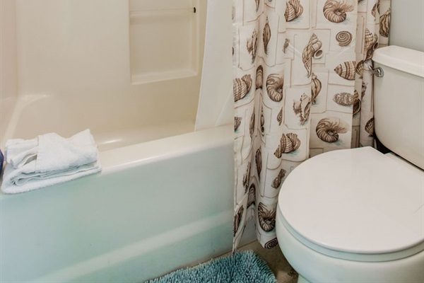 Private ensuite bathroom with single vanity and tub/shower combination